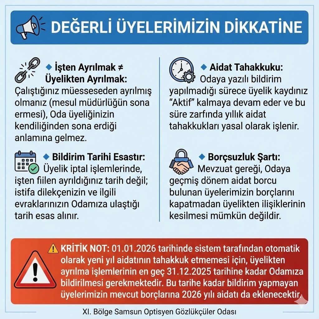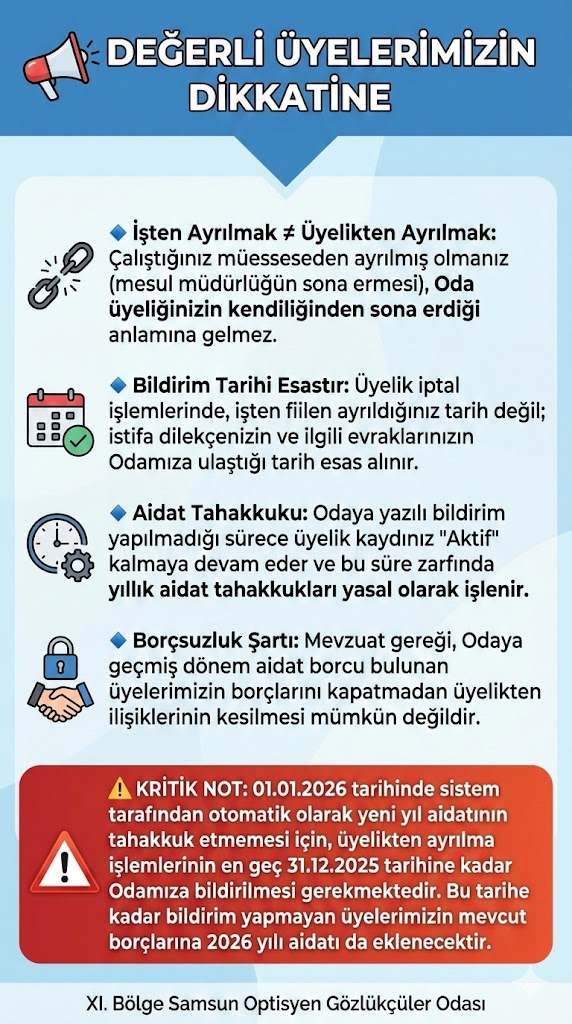 Optisyenlik Hakkında Kanun gereği optisyenlik mesleğini icra eden Optisyen/Gözlükçü ünvanına sahip Mesul Müdürlerin ve Personel Çalışma Belgesiyle çalışan ikinci Optisyen/Gözlükçüler odaya kayıt olmak zorundadır. Son gün 29.11.2019 tarihine kadar kayıt olmayan mesul müdürlerin “ Optisyenlik Müessesesi Ruhsatnamesi” ve ikinci Optisyen / Gözlükçü için var olan “ Personel Çalışma Belgesi” , il sağlık müdürlükleri tarafından iptal olup, SGK sözleşmeleri fesih edilir ve hiçbir şekilde mesleklerini icra edemez duruma gelirler.