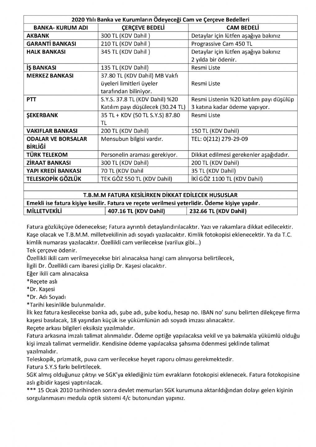 2020 BANKA VE KURUMLARIN ÖDEYECEĞİ CAM VE ÇERÇEVE BEDELLERİ AŞAGIDAKİ BELGELERDE MEVCUTTUR.