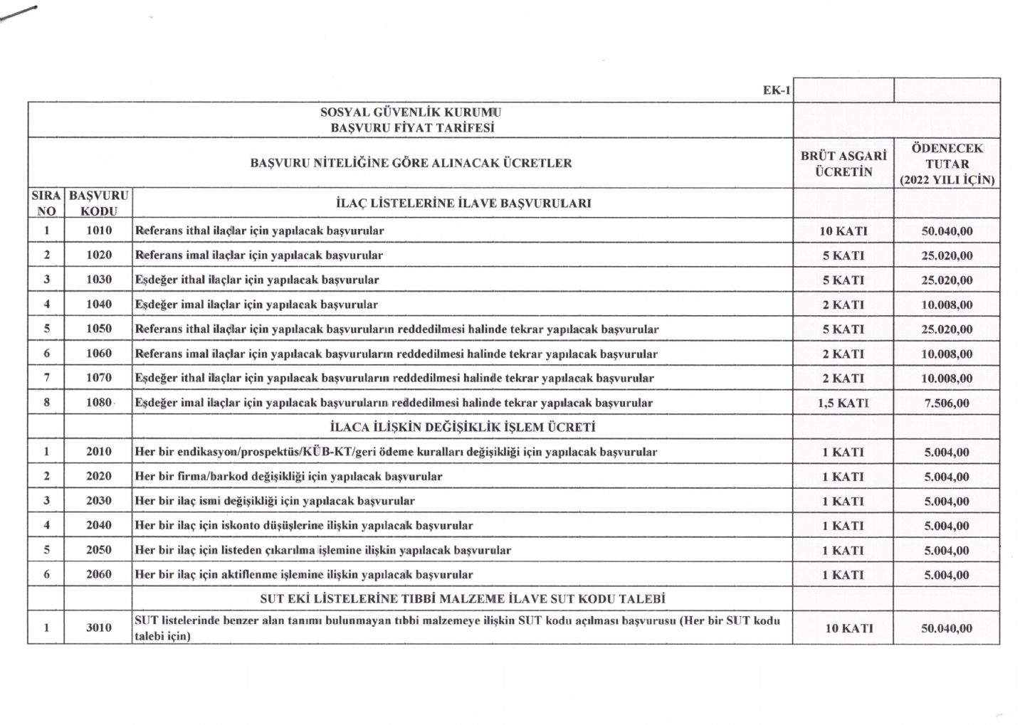ÖDENECEK BEDEL ; 2022 Yılı Brüt Asgari Ücretin ( 5004.-TL) 5/1 ve/veya 0,2 katı ( 1000.80- TL )