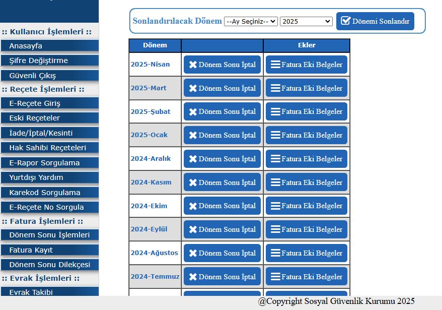 Bu bağlamda, kuruma ay sonunda reçete çıktısı veya diğer belgelerin elden teslimi bitmiştir. Sadece elektronik ortamda teslim yapılacaktır. Ay sonunda dilekçe, icmal listesi ve fatura imzalanarak Medula Sistemine yüklenecektir. Sırasıyla;