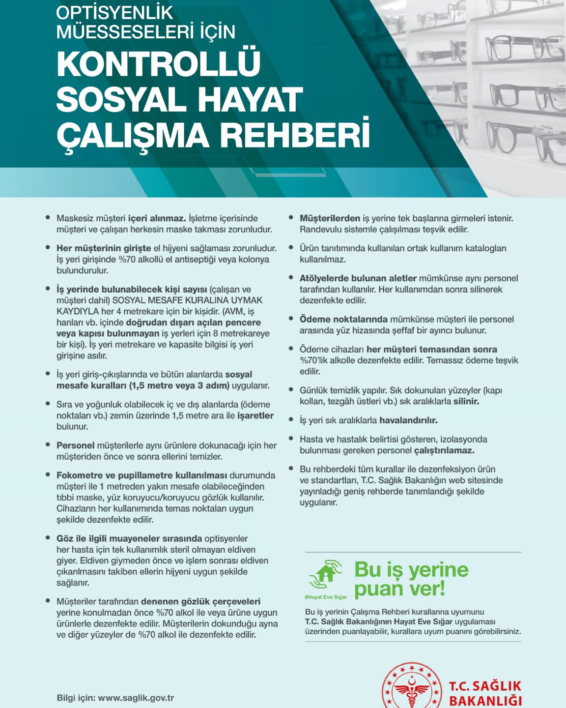T.C. SAĞLIK BAKANLIĞI KORONOVİRÜSLE MÜCADELE İŞ OPTİSYENLİK MÜESSESESİNDE ALINMASI GEREKEN TEDBİRLER DOĞRULTUSUNDA KONTROLLÜ SOSYAL HAYAT ÇALIŞMA REHBERİ YAYINLAMIŞTIR.